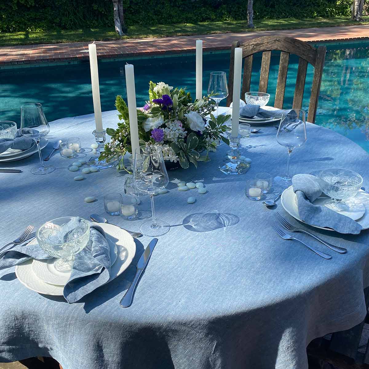 Our tabletop collection is perfect for outdoor dining, indoor dining, everyday meals or special occasions. Simple, sumptuous, and durable our yarn-dyed table linens go from dryer to table for a casual look or with a gentle ironing a more elegant setting. Our generous sized 22” napkins, hard-to-find runners and tablecloths are available in a variety of sizes and colors. Mix and match. Bon Appétit!